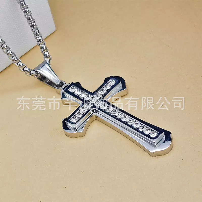 Titanium steel diamond-encrusted double-layer cross necklace