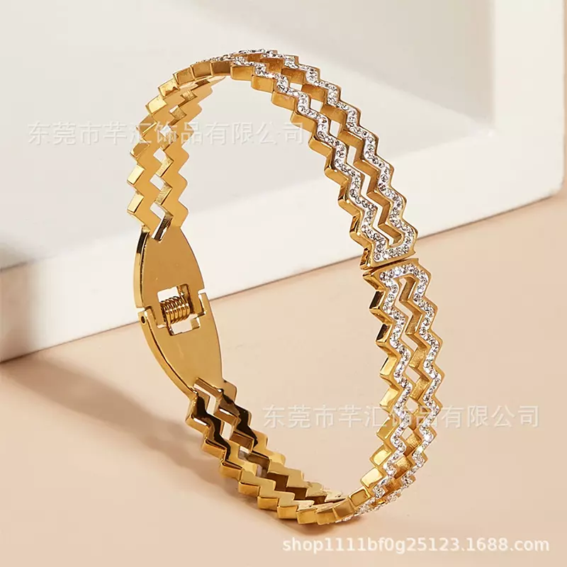 Titanium Steel Gold-Tone Wave Pattern Full Diamond Bracelet